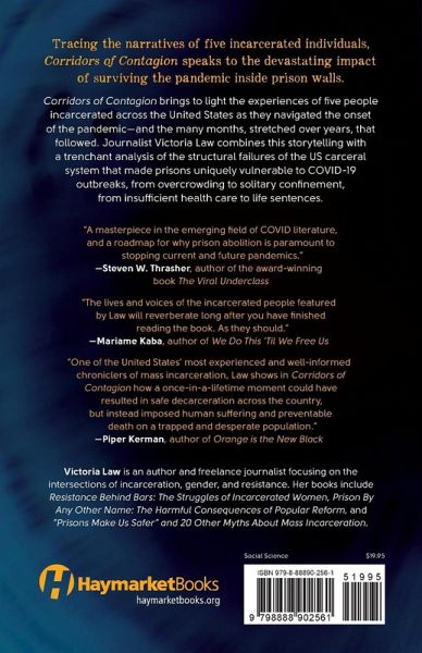 Tracing the narratives of five incarcerated individuals, Corridors of Contagion speaks to the devastating impact of surviving the pandemic inside prison walls. Corridors of Contagion brings to light the experiences of five people incarcerated across the United States as they navigate the onset of the pandemic-and the many months, stretched into years, that followed. Journalist Victoria Law combines this storytelling with a trenchant analysis of the structural failures of the US carceral system: failures that made prisons uniquely vulnerable to COVID-19 outbreaks, from overcrowding to solitary confinement, from insufficient healthcare to life sentences. The book portrays the horrors of continual lockdowns not in the comfort of one's own home, but in prisons where routine violence and chaos is made even more unimaginable by the complete lack of control over protection from a terrifying and lethal new virus. The pandemic provided an opportunity for lawmakers and policy makers to rethink the nation's addiction to perpetual punishment. Instead, US jails and prisons doubled down on punishment under the guise of pandemic protections. As a result, people behind bars experienced increased stress, mental health challenges, increased violence, and higher rates of deaths, many of which could have been prevented. While the pandemic emergency has been declared over, we are continuing to learn more about the extent of its destruction. Corridors of Contagion reminds readers about both the particular horrors experienced by people in cages and the continued role of the US as the world's prison nation.