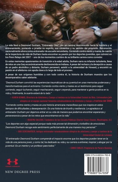 La vida llevó a Desmond Dunham,"Entrenador Dez", por un camino desconocido hacia la hombría y el entrenamiento, poniendo a prueba su espíritu, sus cimientos y su sentido del propósito. Reconocido nacionalmente ahora como entrenador de escuela secundaria, Corriendo contra viento y marea, da cuenta de la trayectoria de vida de Durham hasta encontrar su pasión por los deportes juveniles, que culminó en los Penn Relays del 2007 - uno de los momentos cumbre de su brillante carrera como corredor. En estas memorias apasionantes de transición a la edad adulta, Durham narra su infancia turbulenta, llena de retos en una Gary económicamente desfavorecida en Indiana. A pesar del rechazo y la decepción a causa de un padre alcohólico y distante, Durham perseveró, asistió a la universidad de Howard, y encontró su pasión en el atletismo con ayuda clave a lo largo de todo el proceso. A pesar de sus orígenes humildes y con todo contra él, la historia de Dunham muestra que los desamparados salen adelante.