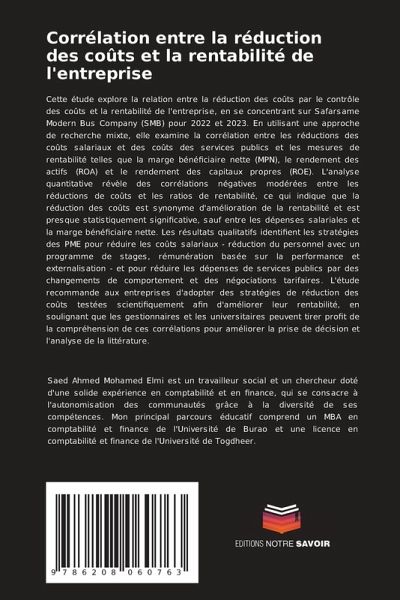 Cette étude explore la relation entre la réduction des coûts par le contrôle des coûts et la rentabilité de l'entreprise, en se concentrant sur Safarsame Modern Bus Company (SMB) pour 2022 et 2023. En utilisant une approche de recherche mixte, elle examine la corrélation entre les réductions des coûts salariaux et des coûts des services publics et les mesures de rentabilité telles que la marge bénéficiaire nette (MPN), le rendement des actifs (ROA) et le rendement des capitaux propres (ROE). L'analyse quantitative révèle des corrélations négatives modérées entre les réductions de coûts et les ratios de rentabilité, ce qui indique que la réduction des coûts est synonyme d'amélioration de la rentabilité et est presque statistiquement significative, sauf entre les dépenses salariales et la marge bénéficiaire nette. Les résultats qualitatifs identifient les stratégies des PME pour réduire les coûts salariaux - réduction du personnel avec un programme de stages, rémunération basée sur la performance et externalisation - et pour réduire les dépenses de services publics par des changements de comportement et des négociations tarifaires. L'étude recommande aux entreprises d'adopter des stratégies de réduction des coûts testées scientifiquement afin d'améliorer leur rentabilité, en soulignant que les gestionnaires et les universitaires peuvent tirer profit de la compréhension de ces corrélations pour améliorer la prise de décision et l'analyse de la littérature.