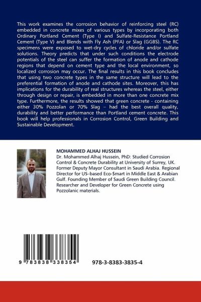 This work examines the corrosion behavior of reinforcing steel (RC) embedded in concrete mixes of various types by incorporating both Ordinary Portland Cement (Type I) and Sulfate-Resistance Portland Cement (Type V) and Blends with Fly Ash (PFA) or Slag (GGBS). The RC specimens were exposed to wet-dry cycles of chloride and/or sulfate solutions. Theory predicts that under such conditions the electrode potentials of the steel can suffer the formation of anode and cathode regions that depend on cement type and the local environment, so localized corrosion may occur. The final results in this book concludes that using two concrete types in the same structure will lead to the preferential formation of anode and cathode sites. Moreover, this has implications for the durability of real structures whereas the steel, either through design or repair, is embedded in more than one concrete mix type. Furthermore, the results showed that green concrete - containing either 30% Pozzolan or 70% Slag had the best overall quality, durability and better performance than Portland cement concrete. This book will help professionals in Corrosion Control, Green Building and Sustainable Development.