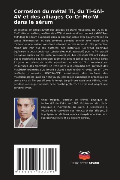 Le potentiel en circuit ouvert des alliages de titane métallique, de TAV et de Co-Cr-W non revêtus, revêtus de n-TCP et revêtus d'un composite GO/CS/n-TCP dans le sérum augmente dans la direction noble avec l'augmentation du temps d'immersion, et cela continue pendant environ une heure avant d'atteindre une valeur constante révélant la croissance du film protecteur formé par l'air sur les surfaces des matériaux. Un circuit électrique équivalent à deux constantes temporelles était approprié pour le film passif de nature duplex sur les matériaux examinés .Les résultats EIS ont indiqué que la résistance à la corrosion augmente avec le temps puis diminue après 21 jours en raison de la décomposition partielle du film protecteur sur lessurfaces des électrodes .La résistance à la corrosion des surfaces des matériaux examinés suit l'ordre suivant : non revêtu < revêtu de n -TCP< revêtudu composite GO/CS/n-TCP. Lerevêtement des surfaces des matériaux testés avec du n-TCP ou du composite augmente le processus de croissance du film passif avec le temps jusqu'à une épaisseur définie, mais pendant une longue période, cette couche protectrice se dissout jusqu'à une certaine limite.