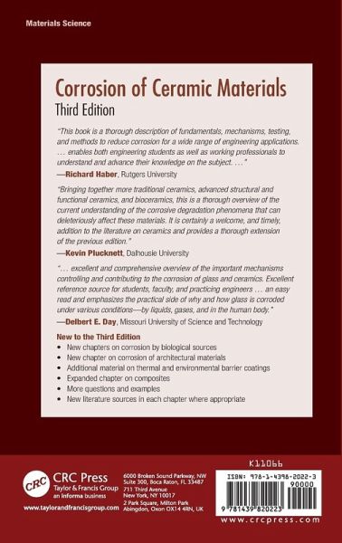 Reflecting the many changes in the field since the publication of the second edition, Corrosion of Ceramic Materials, Third Edition incorporates more information on bioceramics, including nanomaterials, as well as the weathering of construction materials. Adhering to the original plan of classification by chemistry, this edition reorganizes the topics into four main sections: Fundamentals, Corrosion Analysis, Corrosion of Specific Materials, and Properties and Corrosion. New to the Third Edition New chapters on corrosion by biological sources New chapter on corrosion of architectural materials Additional material on thermal and environmental barrier coatings Expanded chapter on composites More questions and examples New literature sources in each chapter where appropriate With an abundance of practical features and new information, this expanded and completely reorganized third edition helps readers address corrosion problems and create the most corrosion-resistant systems possible. Designed as a reference, it could also be used as a text in a graduate or senior undergraduate course.