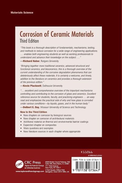 Reflecting the many changes in the field since the publication of the second edition, Corrosion of Ceramic Materials, Third Edition incorporates more information on bioceramics, including nanomaterials, as well as the weathering of construction materials. Adhering to the original plan of classification by chemistry, this edition reorganizes the topics into four main sections: Fundamentals, Corrosion Analysis, Corrosion of Specific Materials, and Properties and Corrosion. New to the Third Edition New chapters on corrosion by biological sources New chapter on corrosion of architectural materials Additional material on thermal and environmental barrier coatings Expanded chapter on composites More questions and examples New literature sources in each chapter where appropriate With an abundance of practical features and new information, this expanded and completely reorganized third edition helps readers address corrosion problems and create the most corrosion-resistant systems possible. Designed as a reference, it could also be used as a text in a graduate or senior undergraduate course.