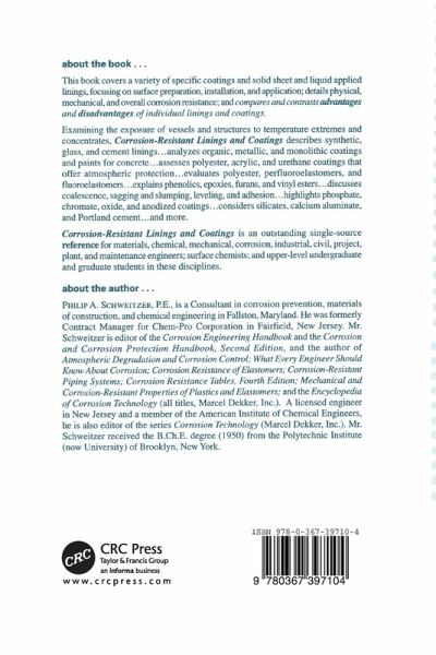 This book covers a variety of specific coatings and solid sheet and liquid applied linings, focusing on surface preparation, installation, and applicaton and detailing physical, mechanical, and overall corrosion resisitance. It compares and contrasts individual linings and coatings including glass, cement, various paints for concrete, and metallic and polymer-based coatings. Then it examines the effects of temperature extremes such as coalescence, sagging and slumping, leveling, and adhesion. The book includes an analysis of organic, metallic, and monolithic coatings and paints for concrete and assesses polyester, acrylic, and urethane coatings that offer atmospheric protection.