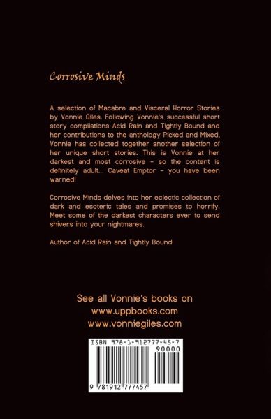 A selection of Macabre and Visceral Horror Stories by Vonnie Giles. Following Vonnie's successful short story compilations Acid Rain and Tightly Bound and her contributions to the anthology Picked and Mixed, Vonnie has collected together another selection of her unique short stories. This is Vonnie at her darkest and most corrosive - so the content is definitely adult... Caveat Emptor - you have been warned! Corrosive Minds delves into her eclectic collection of dark and esoteric tales and promises to horrify. Meet some of the darkest characters ever to send shivers into your nightmares.