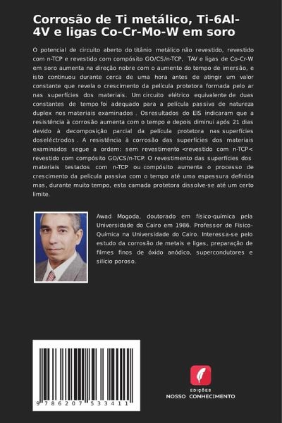 O potencial de circuito aberto do titânio metálico não revestido, revestido com n-TCP e revestido com compósito GO/CS/n-TCP, TAV e ligas de Co-Cr-W em soro aumenta na direção nobre com o aumento do tempo de imersão, e isto continuou durante cerca de uma hora antes de atingir um valor constante que revela o crescimento da película protetora formada pelo ar nas superfícies dos materiais. Um circuito elétrico equivalente de duas constantes de tempo foi adequado para a película passiva de natureza duplex nos materiais examinados . Osresultados do EIS indicaram que a resistência à corrosão aumenta com o tempo e depois diminui após 21 dias devido à decomposição parcial da película protetora nas superfícies doseléctrodos . A resistência à corrosão das superfícies dos materiais examinados segue a ordem: sem revestimento