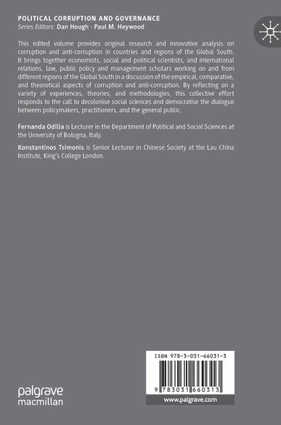 This edited volume provides original research and innovative analysis on corruption and anti-corruption in countries and regions of the Global South. It brings together economists, social and political scientists, and international relations, law, public policy and management scholars working on and from different regions of the Global South in a discussion of the empirical, comparative, and theoretical aspects of corruption and anti-corruption. By reflecting on a variety of experiences, theories, and methodologies, this collective effort responds to the call to decolonise social sciences and democratise the dialogue between policymakers, practitioners, and the general public.