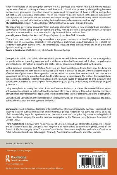 Staffan Andersson is Associate Professor of Political Science at Linnaeus University, Sweden. His research and teaching focus on public administration and comparative politics. Andersson has published widely on issues of risk vulnerability in public organizations and the measurement of corruption in journals including Political Studies and Public Integrity. He was the principal investigator for the National Integrity System Assessment of Sweden (2012). Frank Anechiarico is the Maynard-Knox Professor of Government and Law at Hamilton College. He is editor and co-author of Legal but Corrupt: A New Perspective on Public Ethics, co-author with James Jacobs of The Pursuit of Absolute Integrity: How Corruption Control Makes Government Ineffective, and author of articles in Public Administration Review, Urban Affairs Quarterly, Administration and Society, and other journals.