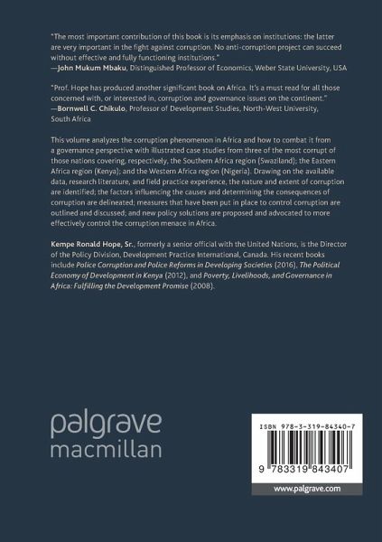 This volume analyzes the corruption phenomenon in Africa and how to combat it from a governance perspective with illustrated case studies from three of the most corrupt of those nations covering, respectively, the Southern Africa region (Swaziland); the Eastern Africa region (Kenya); and the Western Africa region (Nigeria). Drawing on the available data, research literature, and field practice experience, the nature and extent of corruption are identified; the factors influencing the causes and determining the consequences of corruption are delineated; measures that have been put in place to control corruption are outlined and discussed; and new policy solutions are proposed and advocated to more effectively control the corruption menace in Africa.