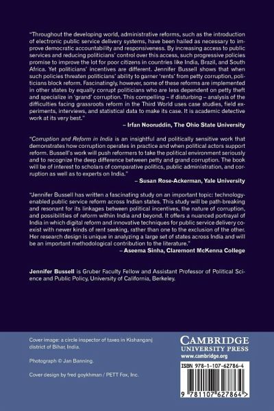 Why do some governments improve public services more effectively than others? Through the investigation of a new era of administrative reform, in which digital technologies may be used to facilitate citizens' access to the state, Jennifer Bussell's analysis provides unanticipated insights into this fundamental question. In contrast to factors such as economic development or electoral competition, this study highlights the importance of access to rents, which can dramatically shape the opportunities and threats of reform to political elites. Drawing on a sub-national analysis of twenty Indian states, a field experiment, statistical modeling, case studies, interviews of citizens, bureaucrats and politicians, and comparative data from South Africa and Brazil, Bussell shows that the extent to which politicians rely on income from petty and grand corruption is closely linked to variation in the timing, management and comprehensiveness of reforms.