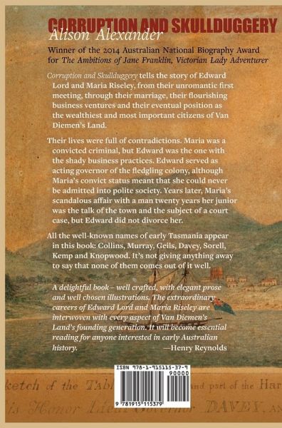 This classic and colourfully illustrated work - reprinted to meet continuing wide demand - tells the story of much of the surprising and hidden shady criminal past of leading figures in early Tasmanian society. It tells the fascinating story of the officer and the convict, Edward Lord and Maria Riseley, who made a fortune in early Hobart by their business and networking skills - only to throw it away in the 1820s by extravagance and financial incompetence (Edward) and sexual infidelity (Maria). This is also the real story of early Hobart, not whitewashed as it usually is to show our glorious beginnings or because the gullible historian actually believes the official sources. Glossing over embarrassing scandals was the least of it. No one in Van Diemen's Land wanted to be there: they were all either sent there (convicts, guards, officials) or, as convicts claimed and was all too often the case, they fled from Britain only one step ahead of the law (free settlers). Everyone wanted to make a fortune, and they weren't too scrupulous about how they did it. Fleecing the British government was the most popular way, but they also fleeced each other, exploited, embezzled, stole ... Almost no one in Hobart's first twenty years has a creditable record. (Don't gloat, Launcestonians: your story is even worse, just not yet told.) Oddly, convicts come out better than the rest, though possibly only because they lacked opportunity. However, Maria Riseley, the ex-convict, seems to have been one of the few business people who was not corrupt. Tough yes, corrupt no (or else she hid it much better than anyone else).