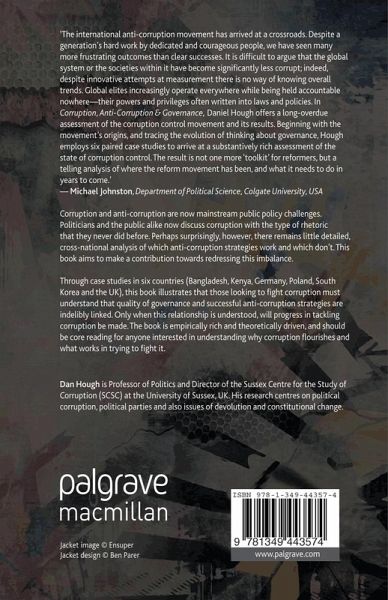 The international anti-corruption movement has arrived at a crossroads. Despite a generation's hard work by dedicated and courageous people we have seen many more frustrating outcomes than clear successes. It is difficult to argue that the global system or the societies within it have become significantly less corrupt; indeed, despite innovative attempts at measurement there is no way of knowing overall trends. Global elites increasingly operate everywhere while being held accountable nowhere their powers and privileges often written into laws and policies. In Corruption, Anti-Corruption, and Governance Daniel Hough offers a long-overdue assessment of the corruption control movement and its results. Beginning with the movement's origins, and tracing the evolution of thinking about governance, Hough employs six paired case studies to arrive at a substantively rich assessment of the state of corruption control. The result is not one more 'toolkit' for reformers, but a telling analysis of where the reform movement has been, and what it needs to do in years to come.