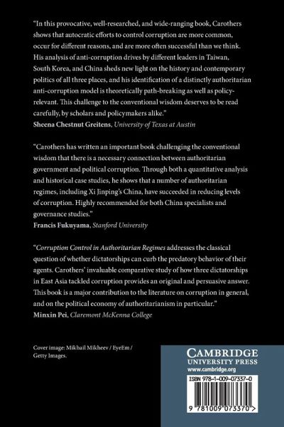 Corruption Control in Authoritarian Regimes argues that authoritarian anti-corruption reform is more common than widely thought and follows a different playbook than democratic anti-corruption reform. Using case studies from China, South Korea, and Taiwan, Christopher Carothers constructs an original theory of authoritarian corruption control.