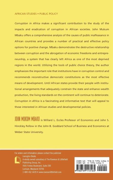 Corruption in Africa makes a significant contribution to the study of the impacts and eradication of corruption in African societies. John Mukum Mbaku offers a comprehensive analysis of the causes of public malfeasance in African countries and provides a number of practical and effective policy options for change.