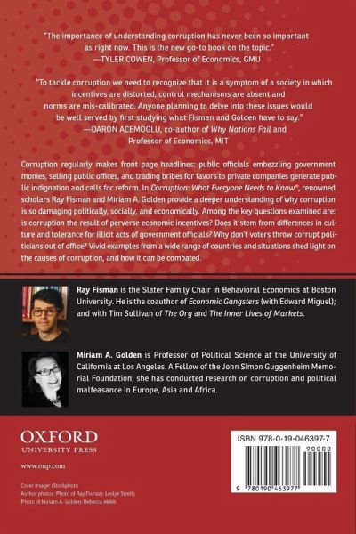 Corruption regularly makes front page headlines: public officials embezzling government monies, selling public offices, and trading bribes for favors to private companies generate public indignation and calls for reform. In Corruption: What Everyone Needs to Know(R), renowned scholars Ray Fisman and Miriam A. Golden provide a deeper understanding of why corruption is so damaging politically, socially, and economically. Among the key questions examined are: is corruption the result of perverse economic incentives? Does it stem from differences in culture and tolerance for illicit acts of government officials? Why don't voters throw corrupt politicians out of office? Vivid examples from a wide range of countries and situations shed light on the causes of corruption, and how it can be combated.