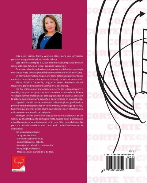 Este es mi primer libro y vendrán otros, para una formación personal integral en la industria de la belleza. Este libro está dirigido a ti, aun si tú no estás preparado en este ramo, solo hace falta que tengas ganas de superación. Cuando estaba de vuelta de un congreso mundial de cosmetología en Francia, París, donde aproveché y tomé cursos de Técnica en Corte. En el avión de vuelta a mi país, me tomé la tarea de plasmar en un escrito los pasos del corte haciendo un bosquejo de todo lo que aprendí. Mi inspiración fue Jesús, un gran maestro. Haciendo de mi trayectoria profesional un libro abierto en la enseñanza. Esa fue mi fórmula y metodología de enseñanza transparente y sencilla, con prácticas precisas, con la cual en mi escuela de Nueva York logré formar profesionales bien capacitados en distintas áreas de la belleza, poniendo mucho empeño y perseverancia en la enseñanza. Logrando que sea una de las escuelas más prestigiosas, graduando a profesionales bien capacitados en conocimiento, aprendizaje y práctica, haciendo que muchos de los alumnos graduados sean profesionales exitosos en este mercado tan exigente. Mi trayectoria es de 40 años trabajando como profesional en un salón y 12 años trabajando como profesora. Quiero dejar plasmado en estos libros mis conocimientos que serán muy útiles para el desarrollo personal de cada uno de ustedes, tanto en lo profesional como en lo económico. ¡Se los puedo asegurar! Los siguientes libros: - Corte de cabello técnicas. - colorimetría en el cabello. - Lo mejor en peinados como realizar. - Maquillaje profesional. - Negocios en el mundo de la belleza.