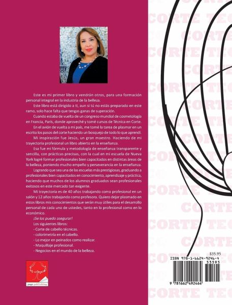 Este es mi primer libro y vendrán otros, para una formación personal integral en la industria de la belleza. Este libro está dirigido a ti, aun si tú no estás preparado en este ramo, solo hace falta que tengas ganas de superación. Cuando estaba de vuelta de un congreso mundial de cosmetología en Francia, París, donde aproveché y tomé cursos de Técnica en Corte. En el avión de vuelta a mi país, me tomé la tarea de plasmar en un escrito los pasos del corte haciendo un bosquejo de todo lo que aprendí. Mi inspiración fue Jesús, un gran maestro. Haciendo de mi trayectoria profesional un libro abierto en la enseñanza. Esa fue mi fórmula y metodología de enseñanza transparente y sencilla, con prácticas precisas, con la cual en mi escuela de Nueva York logré formar profesionales bien capacitados en distintas áreas de la belleza, poniendo mucho empeño y perseverancia en la enseñanza. Logrando que sea una de las escuelas más prestigiosas, graduando a profesionales bien capacitados en conocimiento, aprendizaje y práctica, haciendo que muchos de los alumnos graduados sean profesionales exitosos en este mercado tan exigente. Mi trayectoria es de 40 años trabajando como profesional en un salón y 12 años trabajando como profesora. Quiero dejar plasmado en estos libros mis conocimientos que serán muy útiles para el desarrollo personal de cada uno de ustedes, tanto en lo profesional como en lo económico. ¡Se los puedo asegurar! Los siguientes libros: - Corte de cabello técnicas. - colorimetría en el cabello. - Lo mejor en peinados como realizar. - Maquillaje profesional. - Negocios en el mundo de la belleza.