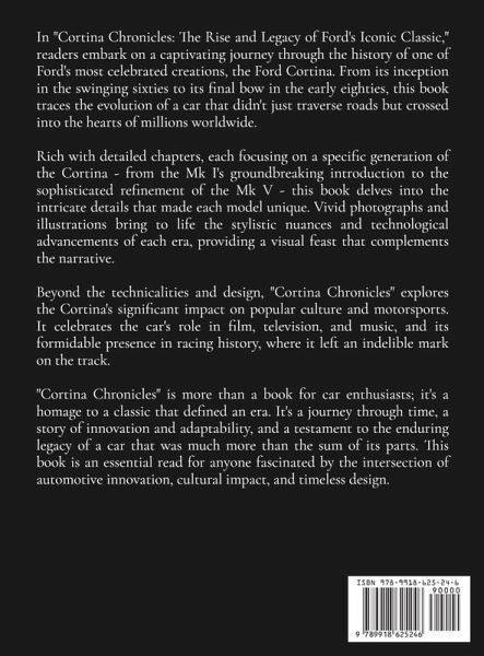 In "Cortina Chronicles: The Rise and Legacy of Ford's Iconic Classic," readers embark on a captivating journey through the history of one of Ford's most celebrated creations, the Ford Cortina. From its inception in the swinging sixties to its final bow in the early eighties, this book traces the evolution of a car that didn't just traverse roads but crossed into the hearts of millions worldwide. Rich with detailed chapters, each focusing on a specific generation of the Cortina - from the Mk I's groundbreaking introduction to the sophisticated refinement of the Mk V - this book delves into the intricate details that made each model unique. Vivid photographs and illustrations bring to life the stylistic nuances and technological advancements of each era, providing a visual feast that complements the narrative. Beyond the technicalities and design, "Cortina Chronicles" explores the Cortina's significant impact on popular culture and motorsports. It celebrates the car's role in film, television, and music, and its formidable presence in racing history, where it left an indelible mark on the track. "Cortina Chronicles" is more than a book for car enthusiasts; it's a homage to a classic that defined an era. It's a journey through time, a story of innovation and adaptability, and a testament to the enduring legacy of a car that was much more than the sum of its parts. This book is an essential read for anyone fascinated by the intersection of automotive innovation, cultural impact, and timeless design.