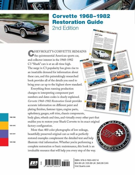 Chevrolet's Corvette remains the quintessential American sports car, and collector interest in the 1968-1982 C3 "Shark" cars is at an all-time high. The surge in C3 popularity has given rise to an insatiable demand for information about these cars, and this painstakingly researched book provides all of the details you need to bring your car up to the highest show standard. Everything from running production changes to interpreting component part numbers and dates codes is clearly explained. "Corvette 1968-1982 Restoration Guide" provides accurate information on different paint and plating finishes, fastener types, engine parts, upholstery, gauges, soft trim, chassis components, body glass, wheels and tires, and virtually every other part that enables you to restore your Shark Corvette to its exact original factory configuration. More than 400 color photographs of low mileage, beautifully preserved original cars as well as perfectly restored examples complement the detailed text and help illustrate vital information. Whether you're performing a complete restoration or basic maintenance, this book is an invaluable resource that will help you every step of the way.