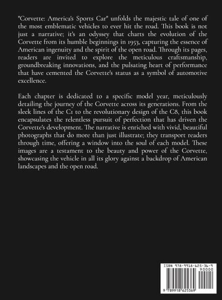 "Corvette: America's Sports Car" unfolds the majestic tale of one of the most emblematic vehicles to ever hit the road. This book is not just a narrative; it's an odyssey that charts the evolution of the Corvette from its humble beginnings in 1953, capturing the essence of American ingenuity and the spirit of the open road. Through its pages, readers are invited to explore the meticulous craftsmanship, groundbreaking innovations, and the pulsating heart of performance that have cemented the Corvette's status as a symbol of automotive excellence. Each chapter is dedicated to a specific model year, meticulously detailing the journey of the Corvette across its generations. From the sleek lines of the C1 to the revolutionary design of the C8, this book encapsulates the relentless pursuit of perfection that has driven the Corvette's development. The narrative is enriched with vivid, beautiful photographs that do more than just illustrate; they transport readers through time, offering a window into the soul of each model. These images are a testament to the beauty and power of the Corvette, showcasing the vehicle in all its glory against a backdrop of American landscapes and the open road.
