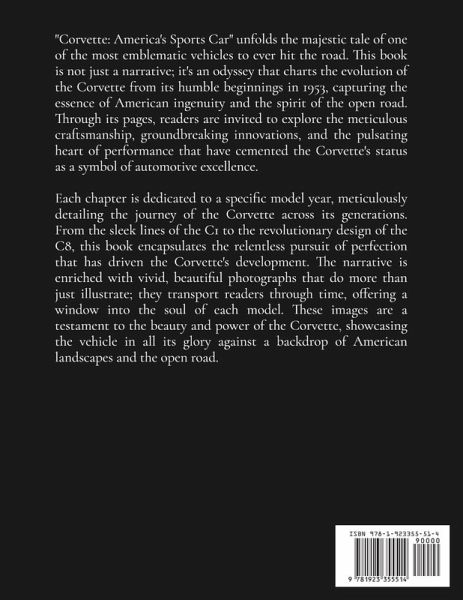 "Corvette: America's Sports Car" unfolds the majestic tale of one of the most emblematic vehicles to ever hit the road. This book is not just a narrative; it's an odyssey that charts the evolution of the Corvette from its humble beginnings in 1953, capturing the essence of American ingenuity and the spirit of the open road. Through its pages, readers are invited to explore the meticulous craftsmanship, groundbreaking innovations, and the pulsating heart of performance that have cemented the Corvette's status as a symbol of automotive excellence. Each chapter is dedicated to a specific model year, meticulously detailing the journey of the Corvette across its generations. From the sleek lines of the C1 to the revolutionary design of the C8, this book encapsulates the relentless pursuit of perfection that has driven the Corvette's development. The narrative is enriched with vivid, beautiful photographs that do more than just illustrate; they transport readers through time, offering a window into the soul of each model. These images are a testament to the beauty and power of the Corvette, showcasing the vehicle in all its glory against a backdrop of American landscapes and the open road.