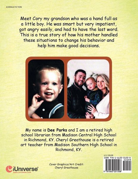 Meet Cory my grandson who was a hand full as a little boy. He was smart but very impatient, got angry easily, and had to have the last word. This is a true story of how his mother handled these situations to change his behavior and help him make good decisions.