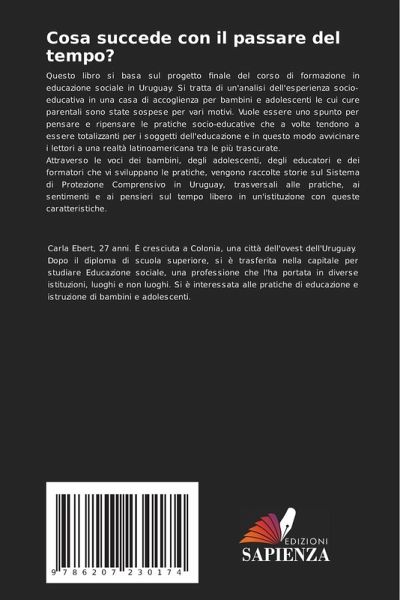 Questo libro si basa sul progetto finale del corso di formazione in educazione sociale in Uruguay. Si tratta di un'analisi dell'esperienza socio-educativa in una casa di accoglienza per bambini e adolescenti le cui cure parentali sono state sospese per vari motivi. Vuole essere uno spunto per pensare e ripensare le pratiche socio-educative che a volte tendono a essere totalizzanti per i soggetti dell'educazione e in questo modo avvicinare i lettori a una realtà latinoamericana tra le più trascurate.Attraverso le voci dei bambini, degli adolescenti, degli educatori e dei formatori che vi sviluppano le pratiche, vengono raccolte storie sul Sistema di Protezione Comprensivo in Uruguay, trasversali alle pratiche, ai sentimenti e ai pensieri sul tempo libero in un'istituzione con queste caratteristiche.