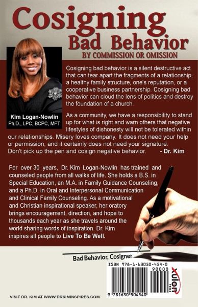 "Cosigning bad behavior is a silent, destructive act that can tear the fragments of a relationship, healthy family structure, reputation, or a cooperative business partnership. It can cloud the lens of politics and destroy the foundation of a church. As a community, we have a responsibility to stand up for what is right and enlighten others that choose to live a negative lifestyle of dishonesty that will not be tolerated within relationships. Misery loves company. It does not need your help, or permission and it certainly does not need your signature. Don't pick up the pen and cosign negative behavior." - Dr. Kim For over 30 years, Dr. Kim Logan-Nowlin has trained and counseled people from all the walks of life. She holds a B.S. in Special Education, a M.A. in Family and Guidance Counseling, and a Ph.D. in Oral and Interpersonal Communication and Clinical Family Counseling. As a motivational and Christian inspirational speaker, her oratory brings encouragement, direction, and hope to thousands each year as she travels around the US and abroad sharing words of inspiration for all ages. Dr. Kim inspires all people to live to be well.