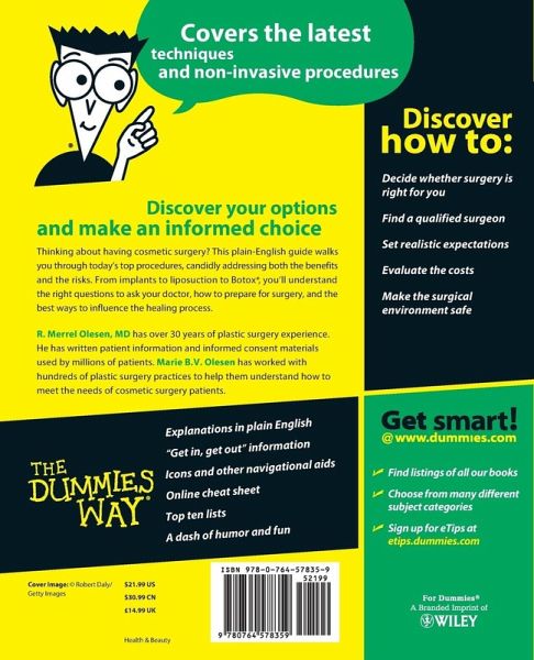 Cosmetic surgery is one of today's hottest topics. From daytime talk shows and popular magazines to conversations at the salon, it seems that almost everyone has had it, is thinking about it, or knows someone who is getting it. Statistics show more and more women-and men-are having cosmetic surgery. And with all the options now available, it's important to be fully informed before you make any decisions about having a procedure. Now, Cosmetic Surgery For Dummies is here to guide you through today's top procedures, candidly addressing both the benefits and the risks. R. Merrel Olesen, MD, the medical director of the La Jolla Cosmetic Surgery Centre, and Marie B.V. Olesen, a nationally known cosmetic surgery consultant, give you the tools you need to: Decide if surgery is right for you Find a qualified surgeon Set realistic expectations Evaluate the costs Enhance your recovery and results This plain-English guide shows you how to take advantage of all the advances in cosmetic surgery while avoiding the pitfalls that could compromise your safety or the quality of your result. From implants to liposuction to Botox, you'll understand the right questions to ask your doctor, how to prepare for surgery (both physically and financially), and the best ways to influence the healing process. You'll also: Discover the latest surgery techniques and medications Understand the different surgeon specializations Sort through the various non-surgical facial treatments Evaluate your post-op care options Cope with complications Deal with family, friends, and coworkers before and after surgery Complete with lists of questions to ask before surgery and top Web sites for cosmetic surgery information, Cosmetic Surgery For Dummies is a practical, friendly guide that will help you say hello to a new you!