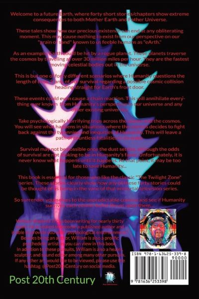 Welcome to a future Earth, where forty short stories/chapters have extreme consequences on both Mother Earth and Father Universe. The short stories show how our precious existence can end at any obliterating moment. This decimation may cause nothing to exist from our point of view on our "grain of sand" known to us feeble humans as "eArth." As an example, Earth could, in all actuality, get hit by a rogue planet. These planets traverse the cosmos by traveling at over 30 million miles per hour. They are the fastest moving celestial bodies out in the universe. This example is but one of forty different short stories where Humanity questions the length of time, if any, of their survival upon a possible cosmic collision heading straight for Earth's doorstep. Cosmological cataclysmic events could even cause a chain reaction. This phenomenon will annihilate everything ever known from Humanity's perspective in our universe and any other existing universes. Take a psychologically (possibly) many horrifying trips across the planet and the cosmos. You will see what happens in situations where the cosmos decides to fight back against the tyrannies and inequities of Humanity. The universe will leave a path of countless fatalities in its wake. After the dust settles, you may or may not survive, although the odds of survival are not looking to be in your favor. Unfortunately, you never know what happens until it happens. At that point, it may be too late to save Humanity. This book is essential for those who like the classic "The Twilight Zone" series. These stories clearly show how these forty stories could have been in the vane of this immortal television series. So surrender yourselves to the untamed cosmos and see if Humanity survives each cosmic bullet thrust upon them...