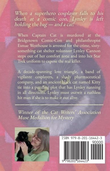 Who killed Captain Cat? His tribe wants to know. When the Captain is murdered at Bridgetown Comic-con and philanthropist Esmae Westhouse is arrested for the crime, sixty-something cat shelter volunteer Lynley Cannon steps out of her comfort zone and dons her Star Trek uniform to expose the real killer. A decade-spanning love triangle, a band of vigilante cosplayers, a shady pharmaceutical company, and an ancient black cat named Kitty tie into a puzzling plot that has Lynley running in all directions. The death of Captain Cat is only the beginning, and Lynley must stay one step ahead of a ruthless hit man if she is to make it out alive.