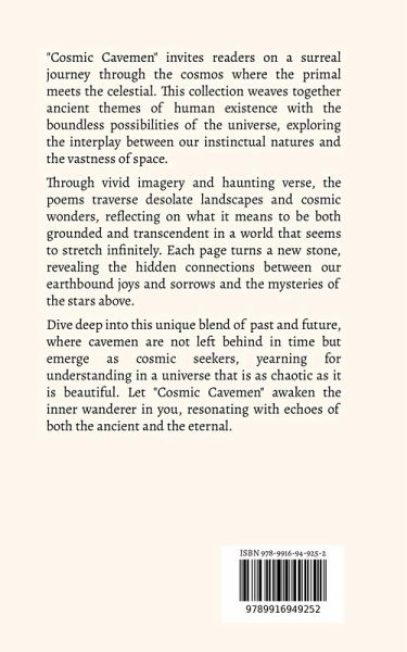 "Cosmic Cavemen" invites readers on a surreal journey through the cosmos where the primal meets the celestial. This collection weaves together ancient themes of human existence with the boundless possibilities of the universe, exploring the interplay between our instinctual natures and the vastness of space. Through vivid imagery and haunting verse, the poems traverse desolate landscapes and cosmic wonders, reflecting on what it means to be both grounded and transcendent in a world that seems to stretch infinitely. Each page turns a new stone, revealing the hidden connections between our earthbound joys and sorrows and the mysteries of the stars above. Dive deep into this unique blend of past and future, where cavemen are not left behind in time but emerge as cosmic seekers, yearning for understanding in a universe that is as chaotic as it is beautiful. Let "Cosmic Cavemen" awaken the inner wanderer in you, resonating with echoes of both the ancient and the eternal.
