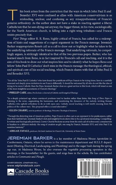 This book arises from the conviction that the ways in which John Paul II and Benedict XVI were confused as allies with American conservativism is as misleading, unclear, and confusing as any misapprehension of Francis's genuine orthodoxy. As the author does not have a stake in reacting against a liberal Catholicism that he sees dying out anyway, the bigger threat, in his view, sociologically, for the North American church, is falling into a right-wing tribalism--and Francis resists precisely that. First Things editor R. R. Reno, highly critical of Francis, has called for a redemption of hints and suggestions of a cogent argument in the Francis message. Jeremiah Barker reappropriates Reno's call as a call to draw out or highlight what he takes to be the underlying rationale of the Francis message. That underlying rationale, he compellingly argues, is strikingly identical to that of the two previous popes. Barker, who has learned much from Reno, is in fact inspired by Francis's call and teaching, and it is the aim of this book to draw out what inspires him and to identify what he hopes Reno and fellow 'John Paul II Catholics' don't miss in the Francis message: the theological, ethical, and spiritual core of his social teaching, which Francis shares with that of John Paul II and Benedict XVI.