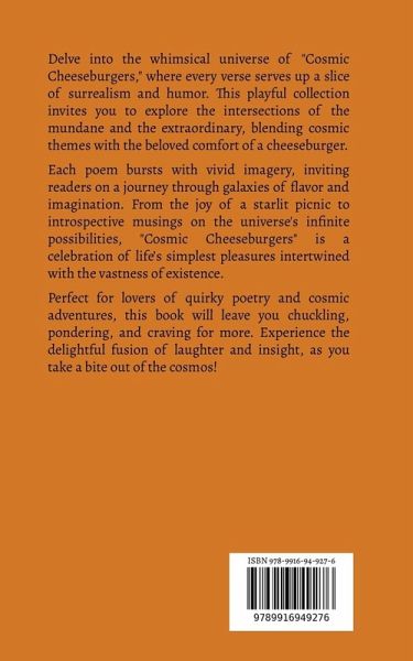 Delve into the whimsical universe of "Cosmic Cheeseburgers," where every verse serves up a slice of surrealism and humor. This playful collection invites you to explore the intersections of the mundane and the extraordinary, blending cosmic themes with the beloved comfort of a cheeseburger. Each poem bursts with vivid imagery, inviting readers on a journey through galaxies of flavor and imagination. From the joy of a starlit picnic to introspective musings on the universe's infinite possibilities, "Cosmic Cheeseburgers" is a celebration of life's simplest pleasures intertwined with the vastness of existence. Perfect for lovers of quirky poetry and cosmic adventures, this book will leave you chuckling, pondering, and craving for more. Experience the delightful fusion of laughter and insight, as you take a bite out of the cosmos!