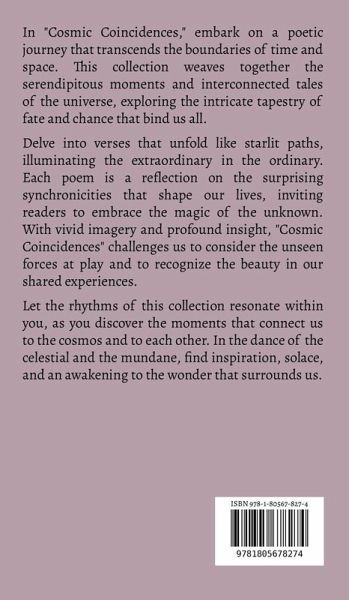 In "Cosmic Coincidences," embark on a poetic journey that transcends the boundaries of time and space. This collection weaves together the serendipitous moments and interconnected tales of the universe, exploring the intricate tapestry of fate and chance that bind us all. Delve into verses that unfold like starlit paths, illuminating the extraordinary in the ordinary. Each poem is a reflection on the surprising synchronicities that shape our lives, inviting readers to embrace the magic of the unknown. With vivid imagery and profound insight, "Cosmic Coincidences" challenges us to consider the unseen forces at play and to recognize the beauty in our shared experiences. Let the rhythms of this collection resonate within you, as you discover the moments that connect us to the cosmos and to each other. In the dance of the celestial and the mundane, find inspiration, solace, and an awakening to the wonder that surrounds us.