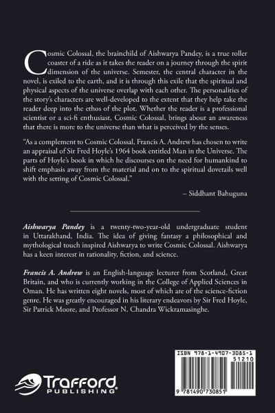 Cosmic Colossal, the brainchild of Aishwarya Pandey, is a true roller coaster of a ride as it takes the reader on a journey through the spirit dimension of the universe. Semester, the central character in the novel, is exiled to the earth, and it is through this exile that the spiritual and physical aspects of the universe overlap with each other. The personalities of the story's characters are well-developed to the extent that they help take the reader deep into the ethos of the plot. Whether the reader is a professional scientist or a sci-fi enthusiast, Cosmic Colossal, brings about an awareness that there is more to the universe than what is perceived by the senses. "As a complement to Cosmic Colossal, Francis A. Andrew has chosen to write an appraisal of Sir Fred Hoyle's 1964 book entitled Man in the Universe. The parts of Hoyle's book in which he discourses on the need for humankind to shift emphasis away from the material and on to the spiritual dovetails well with the setting of Cosmic Colossal." - Siddhant Bahuguna