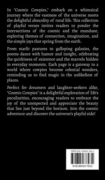 In "Cosmic Cowpies," embark on a whimsical journey where the vastness of the universe meets the delightful absurdity of rural life. This collection of playful verses invites readers to ponder the intersections of the cosmic and the mundane, exploring themes of connection, imagination, and the simple joys that spring from the earth. From starlit pastures to galloping galaxies, the poems dance with humor and insight, celebrating the quirkiness of existence and the marvels hidden in everyday moments. Each page is a gateway to a world where cowpies become celestial wonders, reminding us to find magic in the unlikeliest of places. Perfect for dreamers and laughter-seekers alike, "Cosmic Cowpies" is a delightful exploration of life's peculiarities, encouraging readers to embrace the joy of the unexpected and appreciate the beauty that lies just beyond the horizon. Join the cosmic adventure and discover the universe's playful side!