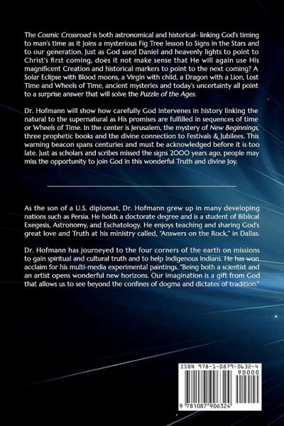 The Cosmic Crossroad is both astronomical and historical- linking God's timing to man's time and joining a mysterious Fig Tree lesson to Signs in the Stars and to our generation. We are a special generation much like Daniel's 70-year generation that saw the return and restoration of Jerusalem. Will we see events shaped by a shadow of Daniels 3 1/2 year prophetical template? Just as God used Daniel and heavenly lights to point to Christ's first coming, does it not make sense that He will again use His magnificent Heavenly Lights, elements of Daniel's Prophecy and historical markers to point to His next coming? A Solar Eclipse with Blood moons, a Virgin with child, a Dragon with a Lion, Lost Time and Wheels of Time, ancient mysteries and today's uncertainty all point to a surprise answer that will solve the Puzzle of the Ages. Dr. Hofmann will show how carefully God intervenes in history linking the natural to the supernatural as His promises are fulfilled in sequences of time or Wheels of Time. We will explore many interesting steps in time related to sequenced periods of time such as the 7, 10, 20, 40, 70, 100, 400 and 1000 day or year periods. In the center is Jerusalem, the mystery of New Beginnings, three prophetic books and the divine connection of Festivals & Jubilees. This is a warning beacon in our Time to draw us to Truth and to solve the puzzle of the century before it is too late. Just as the scholars and scribes missed the signs 2000 years ago, people may miss divine joy unless they read this book. The Bible has many mysteries but the greatest mystery is rarely discussed. This in itself is a great mystery! Recently a renowned Prophecy speaker announced that he was beginning a program on Bible Mysteries. His list did not include Chapter 12 of the book of Revelation which contains at least 5 major mysteries. Revelation is the Key Prophetic book given to us by Jesus Christ himself concerning His Return. It is the only book that promises a Blessing to anyone who reads it, hears it, or understands it. Why? Because it is relevant to our faith and to understanding His Return for the Church, the Judgment of the Earth, and the Kingdom to come including the His Eternal Heaven. This first book in the Cosmic Crossroad Countdown series centers on Revelation 12. God placed it here to get our ATTENTION with both the Sign of the Woman and the Casting of Satan and His Angels out of Heaven. It is a Banner Chapter to get our Attention! It cannot be in Chronological order because Chapter 4 presents the rapture, and Chapter 6 presents the blood of the martyrs; and then 7 the martyred saints gathered in Heaven. How could each of these events happen if Satan and his angels are still in heaven accusing the Saints? You will discover the clear Truth that supports this declaration. This enigmatic chapter speaks of a Dragon, a Child, a Woman, and an array of stars that form the Great Sign. Nowhere in the Bible does God mention a "great sign" except here. Yet, pastors and other leaders teach that this Sign happened before the beginning to time. So I ask you why would God call it "A Great Sign" if people were not yet on earth? These teachers and others are afraid to write about it because God states that anyone who changes the meaning of His Revelation will be cursed. But remember God also says that anyone who reads, hears, or understands His Revelation will be Blessed. This makes the Book of Revelation the most important book in the World to read and understand.