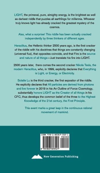 LIGHT, the primeval, pure, almighty energy, is the brightest as well as darkest riddle that puzzles all earthlings for millennia. Whoever truly knows light has already cracked the greatest mystery of the cosmos. Alas, what a surprise! This riddle has been actually cracked independently by three thinkers of different ages. Heraclitus, the Hellenic thinker 2500 years ago, is the first cracker of the riddle with his doctrines that things are constantly changing (universal flux), that opposites coincide, and that Fire is the source and nature of all things-Just translate his fire into LIGHT. 2500 years later, there comes the second cracker Nikola Tesla, the modern Heraclitus, who, in 1899, explicitly declares that Everything is Light, or Energy, or Electricity. Solatle Lu is the third cracker, the first expositor of the riddle. He explicitly declares that All particles are derived from photons and live forever in 2019 in his An Outline of Force Cosmology, substantially honors LIGHT as the Creator of all things in his CFC, thus develops the common belief of the three to the Highest Knowledge of the 21st century, the First Principle. This event marks a great leap in the continuous rational movement of mankind.