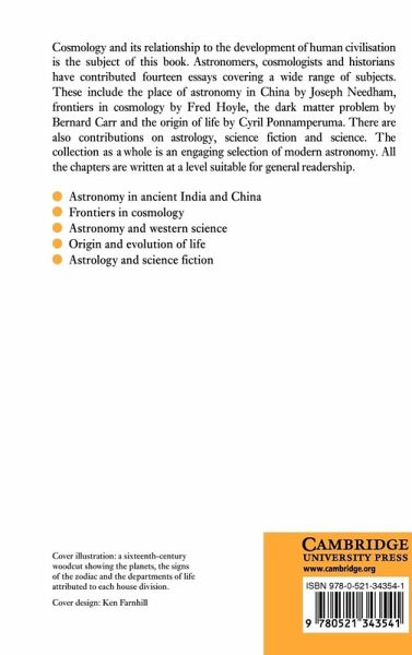 Modern cosmology and its relationship to the development of human civilization is the subject of this book. Astronomers, cosmologists and historians have contributed fourteen essays covering a wide range of subjects. These include the place of astronomy in China by Joseph Needham, frontiers in cosmology by Fred Hoyle, the dark matter problem by Bernard Carr and the origin of life by Cyril Ponnamperuma. There are also contributions on astrology, science fiction and science. The collection as a whole is an engaging selection of modern astronomy. All the chapters are written at a level suitable for general readership.