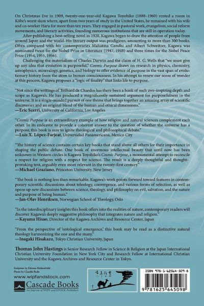 On Christmas Eve in 1909, twenty-one-year-old Kagawa Toyohiko (1888-1960) rented a room in K¿be's worst slum where, apart from two years of study in the United States, he remained with his wife and co-worker Haru for more than ten years. They engaged in pastoral work, evangelism, social reform movements, and literary activities, founding numerous institutions that are still in operation today. After publishing a best-selling novel in 1920, Kagawa began to draw the attention of people from around Japan and the world. His literary output was prodigious, amounting to more than 300 books. Often compared with his contemporaries Mahatma Gandhi and Albert Schweitzer, Kagawa was nominated twice for the Nobel Prize in Literature (1947, 1948) and three times for the Nobel Peace Prize (1954, 1955, 1956). Challenging the materialism of Charles Darwin and the claim of H. G. Wells that ""we must give up any idea that evolution is purposeful,"" Cosmic Purpose draws on research in physics, chemistry, astrophysics, mineralogy, genetics, and biology to offer evidence of purpose in the vast span of evolutionary history from the atom to human consciousness. In his attempt to renew our sense of wonder at this process, Kagawa proposes a ""logic of finality"" that links life to purpose.