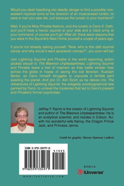 Would you dash headlong into deadly danger to find a possibly non-existent mystical tome at the direction of an incarcerated lunatic, to save a man you saw die, just because the lunatic is your boyfriend? Well, if you're Miss Phoebe Katonic, and the lunatic is Dano K. Dath, and you'll have a heroic squirrel at your side and a robot army at your command, of course you'll go! After all, there were reasons that you were in the Squirrel's Nest Home yourself a couple of years ago. If you're not already asking yourself, "Now, who is this daft squirrel canoe, and why would it want apoplectic cramps?", you soon will be! Join Lightning Squirrel and Phoebe in the world spanning, action packed sequel to The Blawnox Unpleasantness. Lightning Squirrel and Phoebe leave a trail of mayhem as they battle sinister foes across the globe in hopes of saving the lost librarian, Rudolph Barter, as Dano himself struggles to unpuzzle a terrible peril awaiting the planet. And join Dr. Alin Sicoh as he delves into The Adventures of Lightning Squirrel, the allegedly autobiographical tale penned by Dano, to unravel the mysteries that led to Dano's present and Phoebe's former psychoses.
