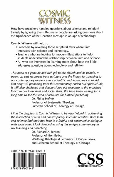 How have preachers handled questions about science and religion? Largely by ignoring them. But many people are asking questions about the significance of the Christian message in an age of technology. Cosmic Witness will help... • Preachers by revealing those scriptural texts where faith intersects with science and technology. • Teachers who are looking for modern illustrations to help students understand the relationship between faith and science. • All who are interested in learning more about how the Bible addresses questions about technology and religion. This book is a genuine and rich gift to the church and its people. It opens up vast resources from scripture and the liturgy for speaking to our contemporary existence in a scientific and technological world. Not only will preaching from this commentary enrich our spiritual life, it will also challenge and deeply shape our response to the preached Word in our individual and social lives. We have been waiting for a long time to see this kind of resource for biblical preaching! Philip Hefner Professor of Systematic Theology Lutheran School of Theology at Chicago I find the chapters in Cosmic Witness to be very helpful in addressing the interaction of faith and contemporary scientific realities. Both faith and science find their due here in a fruitful and constructive dialogue with each other. I look forward to using this unique commentary in my teaching and preaching. Richard A. Jensen Professor of Homiletics Wartburg Theological Seminary and Lutheran School of Theology at Chicago