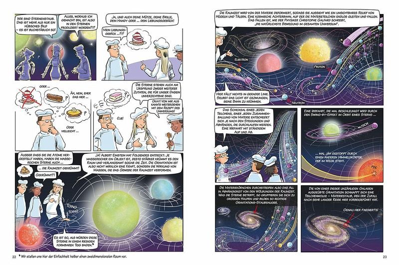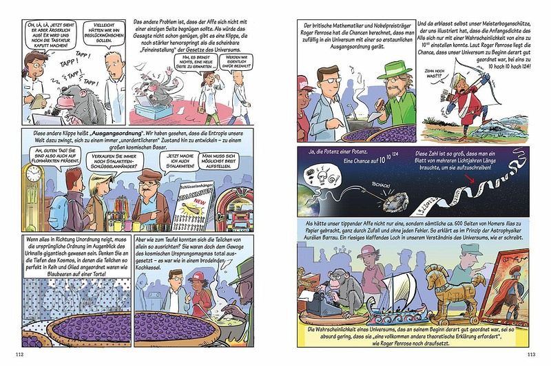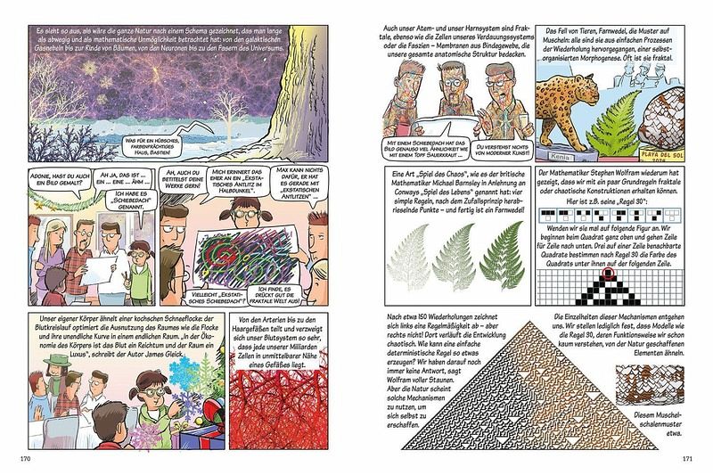 Die Illustrationen sind einfach aussagekräftig, bunt, anschaulich und genau passend für dieses Format. Die einzelnen 10 Kapitel sind übersichtlich und lassen sich je nach Interesse auch unabhängig voneinander lesen, wenn sich im Moment z. B. nur einem bestimmten Gebiet widmen möchte. Dabei kommt das Buch nie trocken oder allzu ernst daher, sodass auch anspruchsvollere Sachverhalte Spaß machen und man am Ende gut informiert über Entropien, Aminosäuren, Evolution und weiteres das Buch zuklappt.