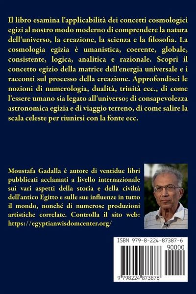 Copre l'applicabilità dei concetti cosmologici egiziane per la nostra moderna comprensione della natura dell'universo, la creazione, la scienza e la filosofia. Il libro esamina l'applicabilità dei concetti cosmologici egizi al nostro modo moderno di comprendere la natura dell'universo, la creazione, la scienza e la filosofia. La cosmologia egizia è umanistica, coerente, globale, consistente, logica, analitica e razionale. Scopri il concetto egizio della matrice dell'energia universale e i racconti sul processo della creazione. Approfondisci le nozioni di numerologia, dualità, trinità ecc., di come l'essere umano sia legato all'universo; di consapevolezza astronomica egizia e di viaggio terreno, di come salire la scala celeste per riunirsi con la fonte ecc. Il libro è diviso in cinque parti per un totale di diciassette capitoli. Parte I: Il monoteismo mistico egizio, composta da un capitolo: Capitolo 1: I più religiosi tratterà il profondo significato mistico del monoteismo per i religiosissimi egiziani, proponendo una panoramica della loro consapevolezza cosmica. Parte II: I principi della creazione, composta da due capitoli - 2 e 3: Capitolo 2: Le Energie che animano l'universo tratterà le conoscenze scientifiche degli Egizi sullo stato del mondo prima della creazione e le energie divine che animano il ciclo della creazione. Capitolo 3: Considerazioni sul processo egizio della creazione illustrerà una panoramica delle tre principali fasi del ciclo della Creazione. Parte III: I codici numerici della Creazione, composta da dieci capitoli - dal 4 al 13: Capitolo 4: Numerologia del processo della creazione tratterà il misticismo numerico nell'Antico Egitto, e analizzerà i numeri due, tre e cinque. Capitolo 5: La Natura dualistica tratterà la natura duale della creazione e ne analizzerà quattordici diverse applicazioni nel sistema egiziano antico. Capitolo 6: Tre - La Trinità nell'Unità tratterà il primo numero dispari [uno non è un numero], il significato dei triplici poteri di una trinità nell'universo, e alcune applicazioni di tale principio nel sistema dell'Antico Egitto. I capitoli dal 7 al 13 tratteranno gli aspetti mistici dei numeri dal quattro al dieci. Parte IV: Come sopra così sotto, composta da due capitoli - 14 e 15: Capitolo 14: L'essere umano - La riproduzione universale esaminerà il modo in cui gli elementi fisici e metafisici dell'uomo costituiscono l'immagine di tutta la creazione. Capitolo 15: La consapevolezza astronomica illustrerà le avanzate conoscenze astronomiche e di calcolo del tempo nell'Antico Egitto, lo zodiaco e il ciclo sotiaco, nonché la natura dell'armonia delle (sette) sfere e la partecipazione popolare alla sua conservazione. Parte V: Da mortali a immortali, composta da due capitoli - 16 e 17: Capitolo 16: Il nostro viaggio terreno tratterà le modalità con cui l'individuo può ricongiungersi con la Fonte divina, tra cui il sufismo, l'alchimia ecc. Capitolo 17: Ascendere la scala celeste tratterà la vita ultraterrena, la trasmigrazione dell'anima, la progressione attraverso i vari regni verso la riunificazione e la deificazione.