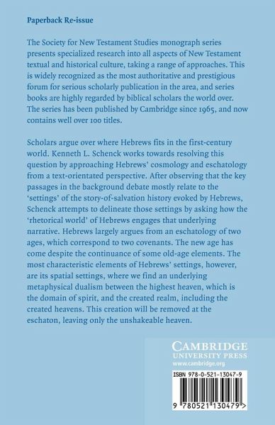 Scholars argue over where Hebrews fit in the first century world. Kenneth L. Schenck works towards resolving this question by approaching Hebrews' cosmology and eschatology from a text-orientated perspective. After observing that the key passages in the background debate mostly relate to the 'settings' of the story of salvation history evoked by Hebrews, Schenck attempts to delineate those settings by asking how the 'rhetorical world' of Hebrews engages that underlying narrative. Hebrews largely argue from an eschatology of two ages, which correspond to two covenants. The fresh age has come despite the continuance of some old age elements. The most characteristic elements of Hebrews' settings, however, are its spatial settings, where we find an underlying metaphysical dualism between the highest heaven, which is the domain of spirit, and the created realm, including the created heavens. This creation will be removed at the eschaton, leaving only the unshakeable heaven.