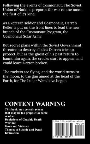 Following the events of Cosmonaut, The Soviet Union prepares for war on the moon, the first of it's kind As a veteran soldier and Cosmonaut, Darren Keller is put on the front lines to lead the new branch of the Cosmonaut Program, the Cosmonaut Solar Army. But secret plans within the Soviet Government threaten to destroy all that Darren tries to protect, but as the ghost of his past return to haunt him again, the cracks start to appear, and could leave Darren broken. The rockets are flying, the world turns to the moon, to the gun aimed at the head of the Soviet Union. The Lunar Wars have begun Content Warning: This book may contain scenes that may be too graphic for some readers: Depictions of Graphic Death Warfare Guns and Violence Themes of Suicide and Death Idolization