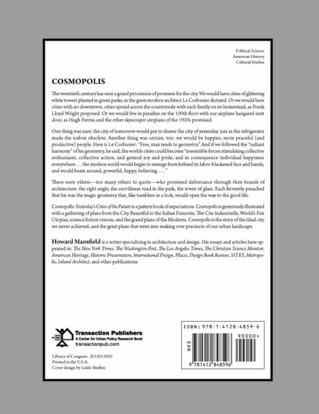 The twentieth century saw a grand procession of promises for the city. The great modern architect Le Corbusier dictated cities of glittering white towers planted in green parks, Frank Lloyd proposed cities with no downtown, cities spread across the countryside with each family on its homestead, and skyscraper utopians of the 1920s promised paradise on the one-hundredth floor with our airplane hangared next door. One thing was sure: the city of tomorrow would put to shame the city of yesterday. Another thing was certain, too: we would be happier, more peaceful (and productive) people. Here is Le Corbusier: "Free, man tends to geometry." And if we followed the "radiant harmony" of his geometry, the world's cities could become "irresistible forces stimulating collective enthusiasm, collective action, and general joy and pride, and inconsequence individual happiness everywhere . . . the modern world would emerge . . . and would beam around, powerful, happy, believing." There were others who promised deliverance through their brands of architecture: the right angle, the curvilinear road in the park, the tower of glass. Each fervently preached that his was the magic geometry that, like tumblers on a lock, would open the way to the good life. Cosmopolis is a pattern book of expectations, generously illustrated with a gathering of plans from the City Beautiful to the Italian Futurists, The Cité Industrielle, World's Fair utopias, science fiction visions, and the grand plans of the Moderns. Cosmopolis is the story of the ideal city we never achieved, and the great plans that went into making-over precincts of our urban language.
