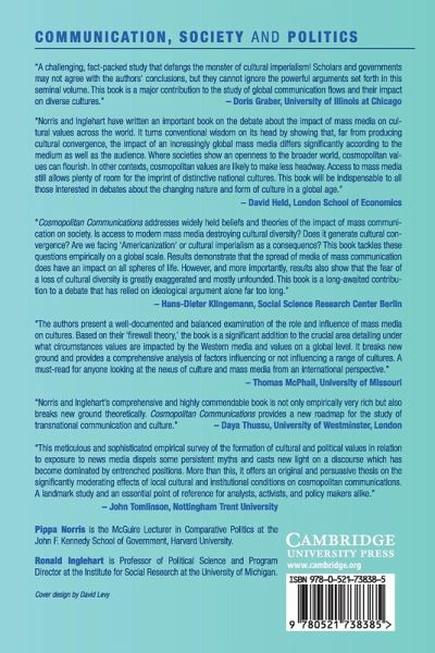 Societies around the world have experienced a flood of information from diverse channels originating beyond local communities and even national borders, transmitted through the rapid expansion of cosmopolitan communications. For more than half a century, conventional interpretations, Norris and Inglehart argue, have commonly exaggerated the potential threats arising from this process. A series of firewalls protect national cultures. This book develops a new theoretical framework for understanding cosmopolitan communications and uses it to identify the conditions under which global communications are most likely to endanger cultural diversity. The authors analyze empirical evidence from both the societal level and the individual level, examining the outlook and beliefs of people in a wide range of societies. The study draws on evidence from the World Values Survey, covering 90 societies in all major regions worldwide from 1981 to 2007. The conclusion considers the implications of their findings for cultural policies.