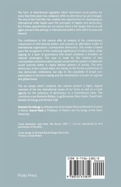 The form of international regulation which dominated world politics for more than forty years has collapsed, while no alternative has yet emerged. The end of the Cold War has created new opportunities for developing an international order based upon the principles of legality and democracy. But if these opportunities are not seized, there is the danger that force will again prevail in the settings of international politics, both within Europe and beyond. The contributors to this volume offer an analysis of the contemporary conjuncture in international politics and present an alternative model of international organization: cosmopolitan democracy. This model is based upon the recognition of the continuing significance of nation-states, while arguing for a layer of governance that would constitute a limitation on national sovereignty. The case is made for the creation of new cosmopolitan institutions which would coexist with the system of states but would override states in clearly defined spheres of activity. The term democracy in this context refers not merely to the formal construction of new democratic institutions, but also the possibility of broad civic participation in decision-making and the redistribution of power at regional and global levels. The six essays which comprise this volume present a highly original overview of the key international issues of our times as well as a novel agenda for the extension of democracy on a transnational basis. The contributors are Norberto Bobbio, Luigi Bonanate, Mary Kaldor, David Held, Daniele Archibugi and Richard Falk.